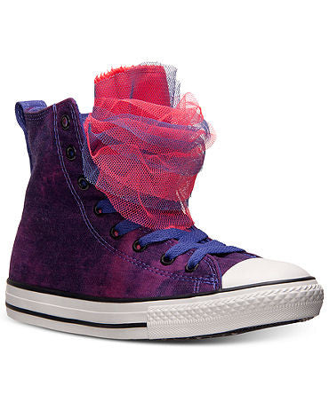 Meeting at the intersection of old school style and new age edge are the Girls' Converse Chuck Taylor All Star Party Sneakers. This all-time favorite transforms into a full-on foot party with colorful accents on the tongue and an eye-catching interior. Canvas upper; man-made sole Imported Converse girls grade school casual sneakers Colorful accents at the tongue All Star branding Textile-lined midsole Style no. 642818F Kids' athletic footwear from Finish Line